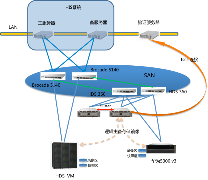 柏科VRD7500虛擬化網(wǎng)關(guān),實(shí)現(xiàn)HDS VM存儲(chǔ)和華為5300 V3存儲(chǔ)雙活,實(shí)現(xiàn)HIS系統(tǒng)的全冗余架構(gòu)。同時(shí)利用快照、CDP功能實(shí)現(xiàn)邏輯故障防護(hù),并通過(guò)驗(yàn)證服務(wù)器隨時(shí)對(duì)容災(zāi)系統(tǒng)進(jìn)行恢復(fù)驗(yàn)證。