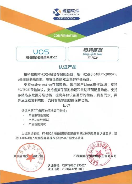 柏科數(shù)據(jù) FT-RD24融合存儲(chǔ)服務(wù)器與UOS統(tǒng)信服務(wù)器操作系統(tǒng)V20順利完成產(chǎn)品功能性、兼容性及性能測(cè)試。測(cè)試結(jié)果表明,UOS操作系統(tǒng)在柏科數(shù)據(jù)FT-RD24融合存儲(chǔ)服務(wù)器中穩(wěn)定運(yùn)行,安全可靠且性能卓越。同時(shí),F(xiàn)T-RD24融合存儲(chǔ)服務(wù)器已被納入統(tǒng)信服務(wù)器操作系統(tǒng)V20產(chǎn)品生態(tài)伙伴,共同推動(dòng)國(guó)家信息安全建設(shè)。