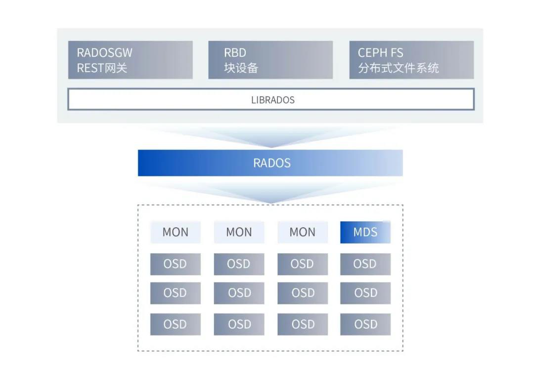 為了更加適應(yīng)動(dòng)態(tài)變化的應(yīng)用場(chǎng)景,出現(xiàn)了去中心化Ceph的分布式存儲(chǔ)架構(gòu),它是由MON、OSD、MDS與RADOS等核心組件構(gòu)成。與HDFS相比之下,沒(méi)有通過(guò)NameNode元數(shù)據(jù)尋址的方式,而是通過(guò)一種CRUSH算法,通過(guò)兩次映射計(jì)算數(shù)據(jù)存儲(chǔ)位置來(lái)確定如何存儲(chǔ)和檢索數(shù)據(jù)。CRUSH 使用戶(hù)端能直接與OSDs進(jìn)行通信,且并行讀寫(xiě)速度更高。
